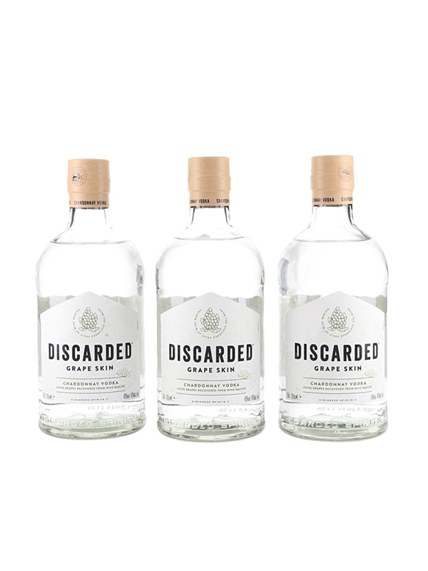 This lot contains three bottles of Discarded Grape Skin Chardonnay Vodka. This was produced in Scotland by William Grant & Sons Limited.