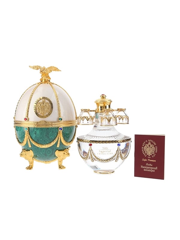 The presentation box contains a Fabergé style egg, decorated with crystal and gold detail and topped with a gold eagle. Inside the egg is a decanter containing super premium vodka, distilled from wheat and rye with water from Lake Ladoga, and four small glasses with gold and enamel decoration.