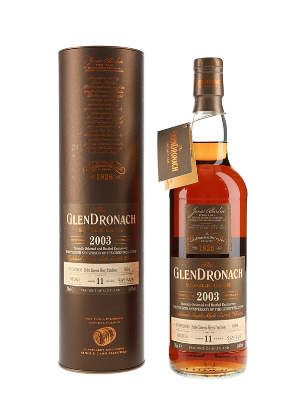 A bottle The Glendronach 11 Year Old. This was distilled on 5 March 2003, matured in a single Pedro Ximenez Sherry Puncheon Cask, and bottled for the Green Welly Stop in January 2015.