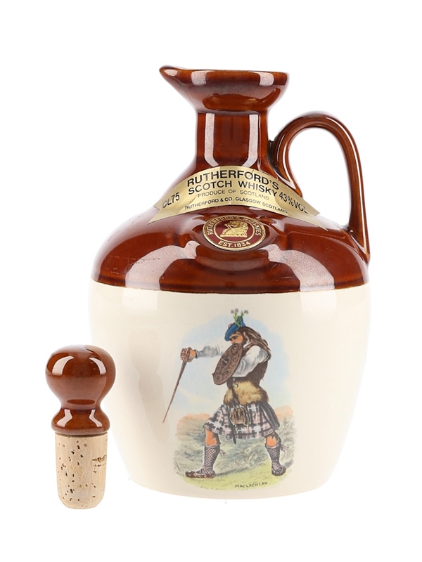 A bottle of Rutherford's Blended Scotch Whisky presented in a ceramic decanter. We estimate this was bottled in the 1980s.