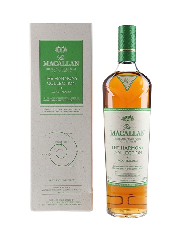 A bottle of The Macallan Smooth Arabica Highland Single Malt Scotch Whisky from The Harmony Collection. This is inspired by the Ethiopian Arabica bean, in collaboration with inspiring masters from around the world of coffee.