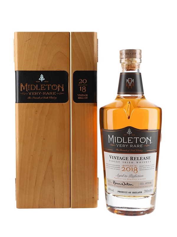 A bottle of Midleton Very Rare Irish Whiskey bottled in 2018. Every year since 1984, a new edition has been released in limited quantities. This comes in a wooden presentation box with a certificate of authenticity.This is bottle number 07556.