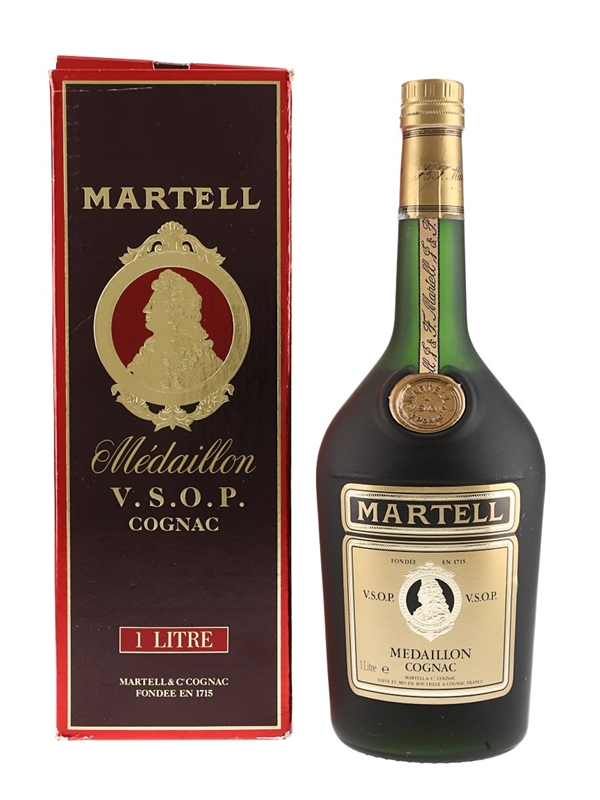 A litre bottle of Martell Medaillon VSOP Cognac, we estimate bottled in the 1980s.