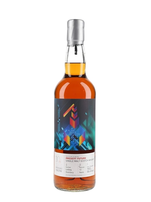 A bottle of Ledaig 12 Year Old Present Future Single Malt Scotch Whisky. This was distilled in 2005 and bottled as a part of The Future of Whisky series from The Whisky Exchange at a cask strength of 58.4% ABV, a range showcasing the past, present and future of Scotch whisky. This was released for The Whisky Show 2018 and it has a 3d lenticular label featuring a futuristic depiction of a pot still.