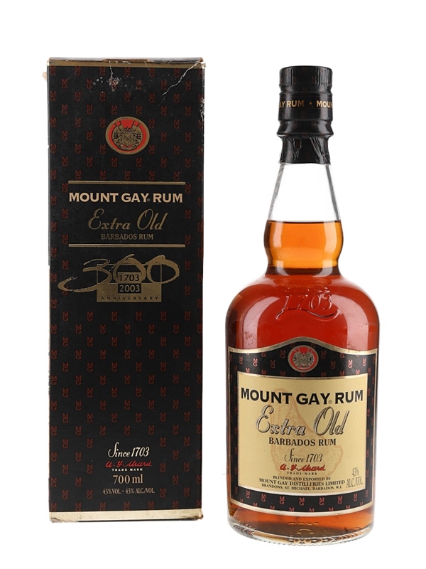 A bottle of Mount Gay Extra Old Barbados Rum, blended and exported by Mount Gay Distilleries Limited. This was bottled in to celebrate the distillery's 300th anniversary in 2003. This was imported to France by Cointreau.
