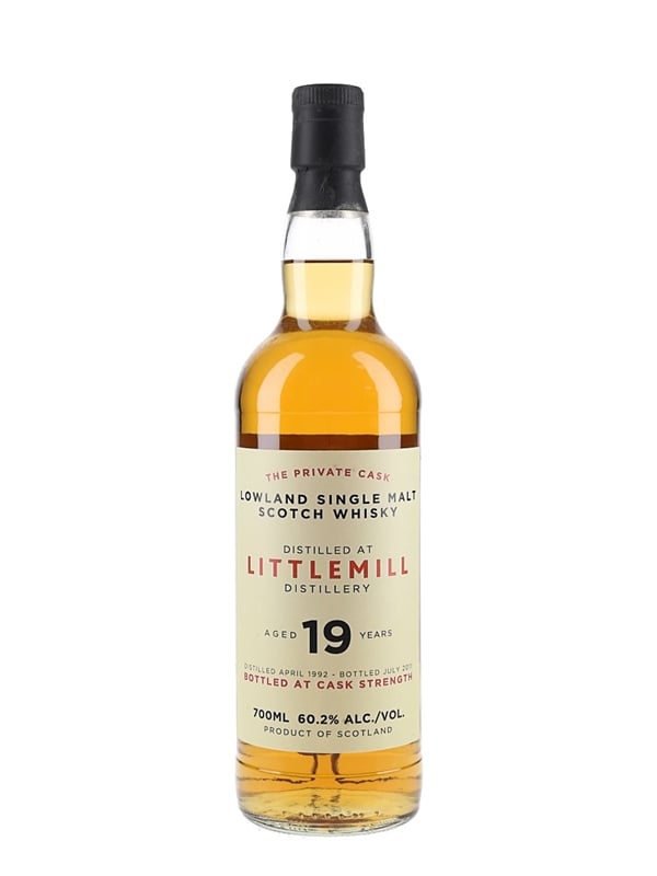 A bottle of Littlemill 19 Year Old Single Malt Scotch Whisky. This was distilled in April 1992 and bottled at a cask strength of 60.2% ABV in July 2011 as part of the Private Cask series.