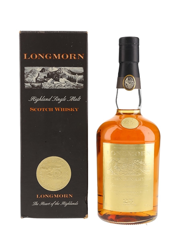 A bottle of Longmorn Centenary 25 Year Old Single Malt Scotch Whisky. This was released in the mid 1990s to celebrate the distillery's centenary, and was only presented to staff and dignitaries.