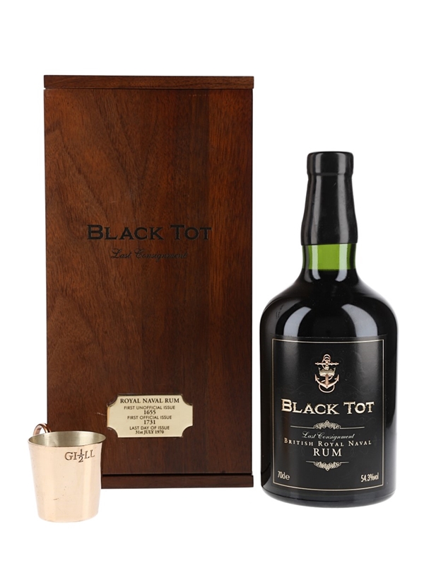 A bottle of Black Tot Navy Rum. Bottled from the Last Consignment of stock of Royal Naval Rum, which had been hidden in storage since Black Tot Day in 1970 - the day that the 300-year-old tradition of serving a daily ration of rum to naval crew ended - Black Tot is a real piece of rum (and naval) history.