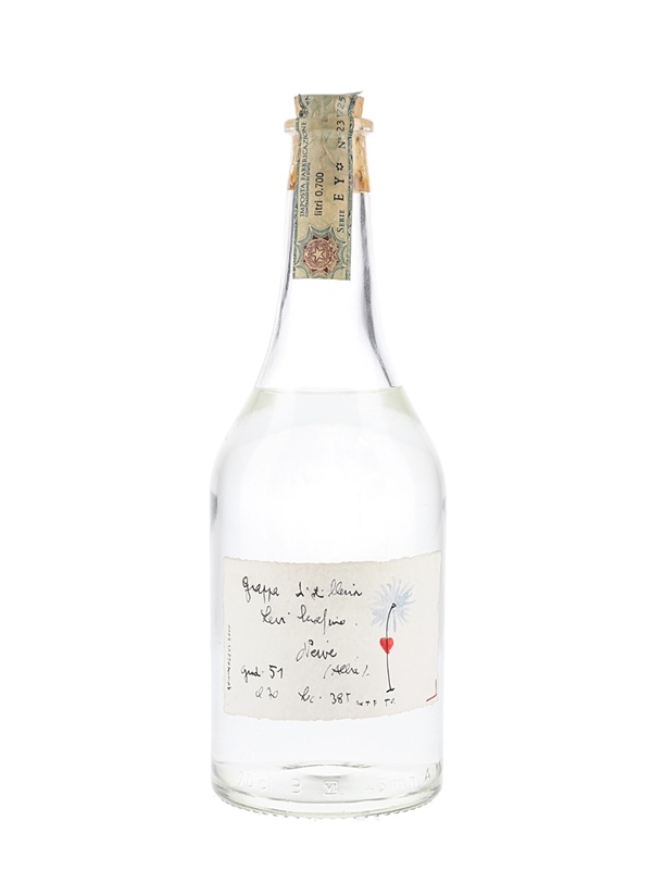 A bottle of Romano Levi grappa, produced at Distillerie Levi Serafino, Neive Alba, and bottled in 2000.