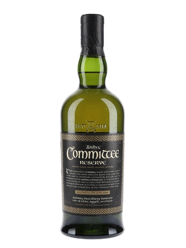 A bottle of Ardbeg Committee Reserve, a special bottling released in 2002 for members of the distillery's fan club. This is a vatting of whiskies distilled in the 1970s, 1980s, and 1990s, and is bottled at cask strength.