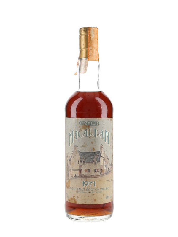 A bottle of The Macallan 1971 Single Malt Scotch Whisky. This was distilled in 1971, matured in two sherry wood casks and bottled in 1995 by Italian importer Samaroli.
