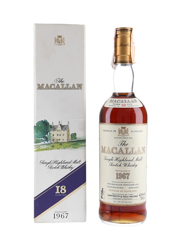 A bottle of The Macallan 18 Year Old Single Highland Malt Scotch Whisky. This was distilled in 1967, matured in sherry casks and bottled in the 1980s. This was imported to Italy by Giovinetti & Figli.