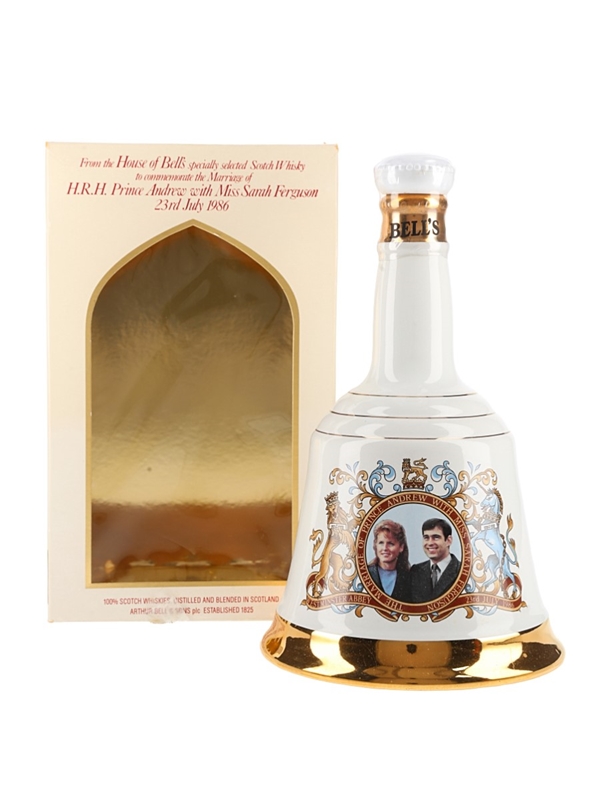 A bottle of Bell's Scotch Whisky released in 1986. This was presented in a porcelain decanter to celebrate the marriage of Prince Andrew and Sarah Ferguson.