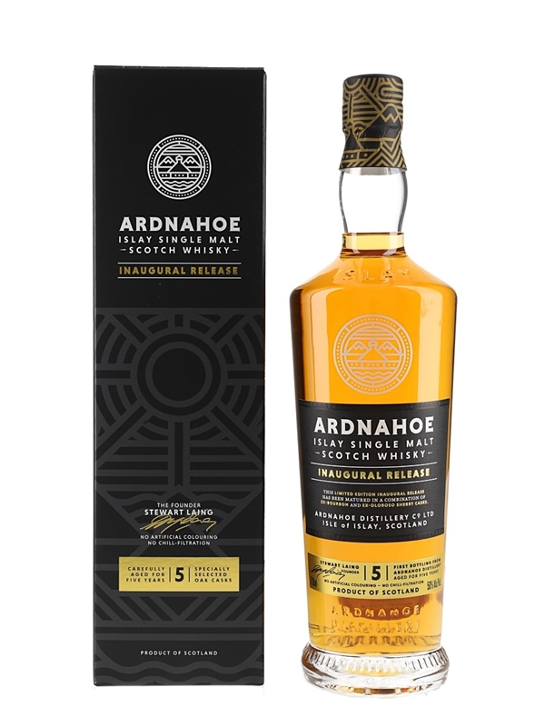 A bottle Ardnahoe Inaugural Release Islay Single Malt Scotch Whisky matured for 5 years in a combination of bourbon and Oloroso sherry casks and bottled at 50% ABV.