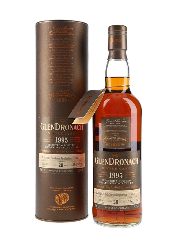 A bottle of Glendronach 20 Year Old, distilled on 25 October 1995 and matured in a single Pedro Ximanez Sherry Puncheon before bottling in November 2015.