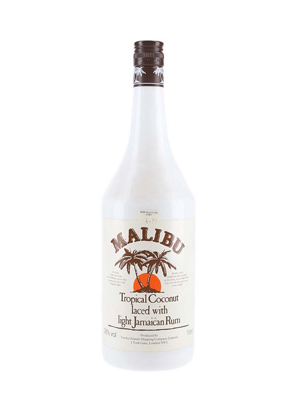 A litre bottle of Malibu Tropical Coconut laced with light Jamaican Rum produced by Twelve Islands Shipping Company Limited. We estimate in the 1980s.