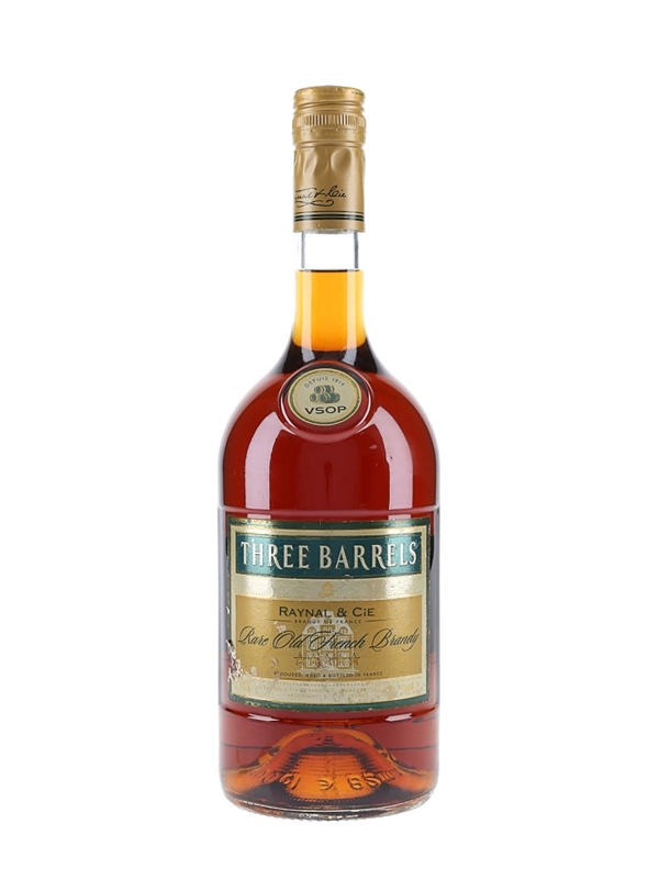 A litre bottle of Raynal Three Barrels VSOP 5 Star Rare Old French Brandy.