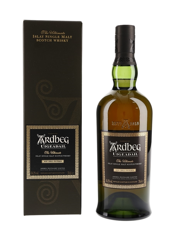 A bottle of Ardbeg Uigeadail Islay Single Malt Scotch Whisky.