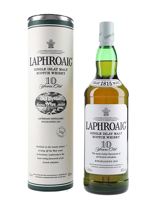 A litre bottle of Laphroaig 10 Year Old Single Islay Malt Scotch Whisky. We estimate this was bottled in the 2000s.