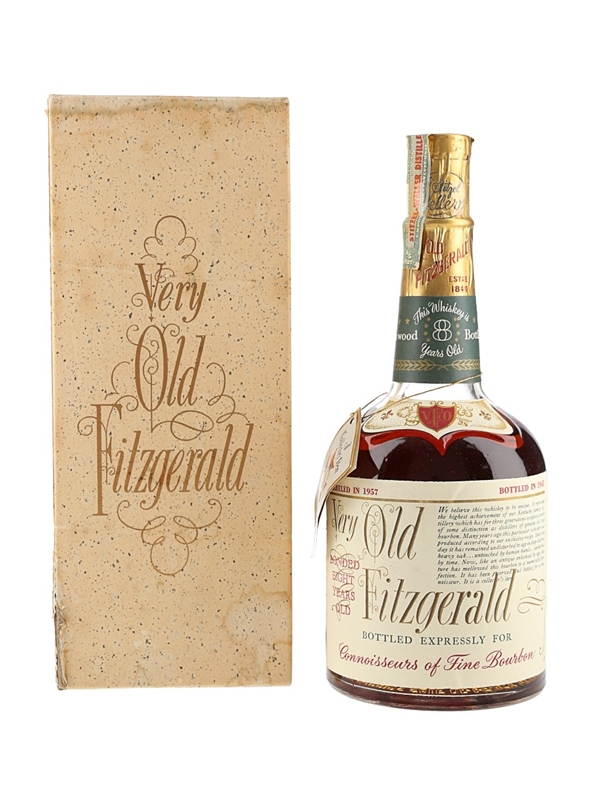A bottle of Very Old Fitzgerald 8 Year Old. This whiskey was barrelled in 1957 at Stitzel-Weller distillery, and bottled in 1965.