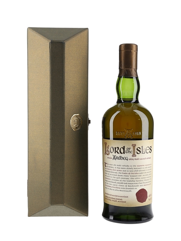 A bottle of Ardbeg Lord of the Isles Single Islay Malt Scotch Whisky, matured for 25 years and bottled at 46% ABV. It was first launched in 2001 and production continued until 2007. This is presented with a scroll telling the story of Somerled, a Celtic-Norse warlord and the first Lord of the Isles.