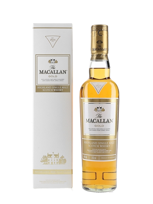 A 35cl bottle of The Macallan Gold Highland Single Malt Scotch Whisky, exclusively matured in sherry oak casks from Jerez, Spain, and bottled as part of The 1824 Series.