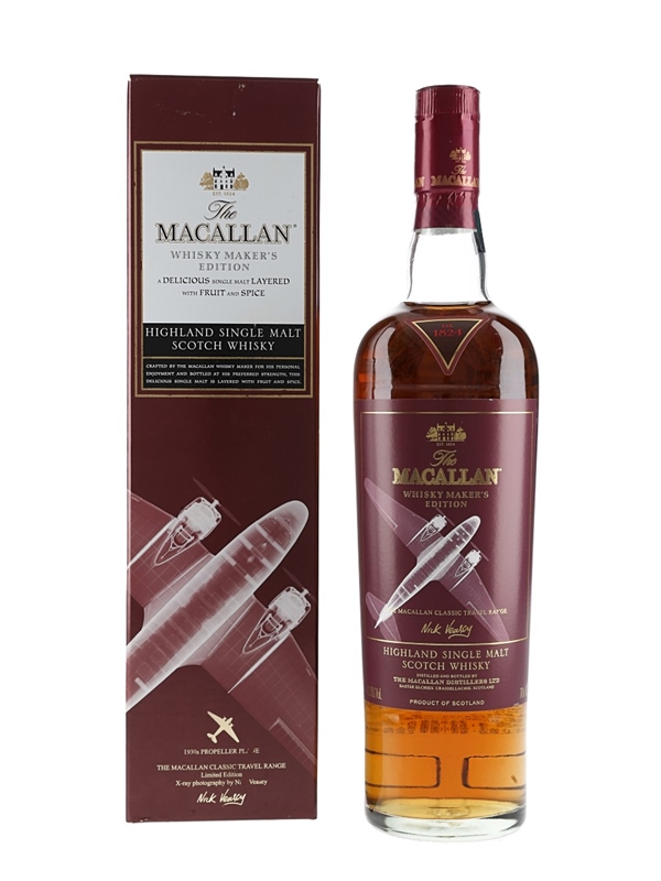 A bottle of The Macallan Whisky Maker's Edition from the Classic Travel range. Each bottle in the series carries an x-ray image by Nick Veasey. The box and label feature a 1930s Propeller Plane.