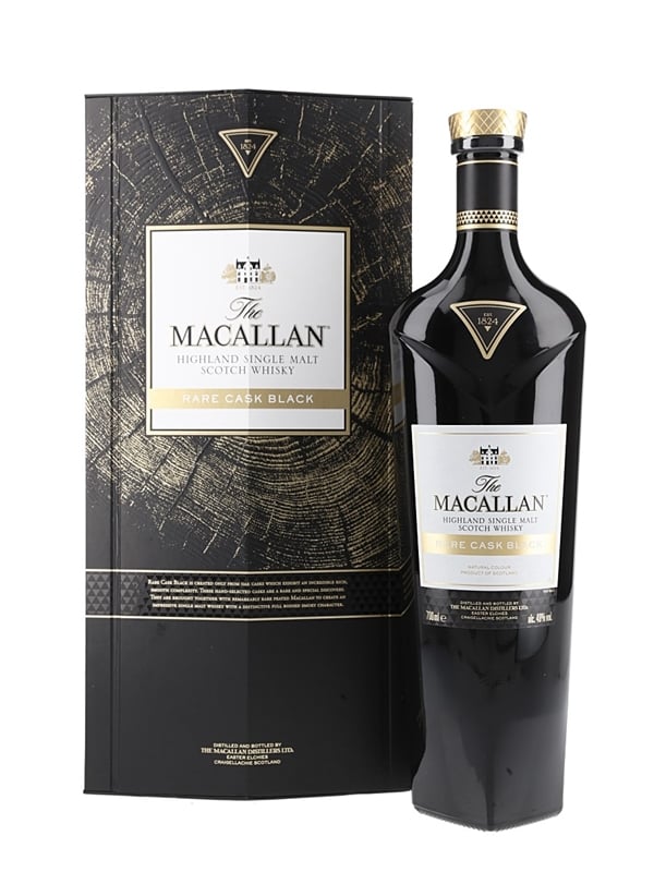 A bottle of The Macallan Rare Cask Black Highland Single Malt Scotch Whisky, made from peated malt matured in first fill sherry casks. This was hand selected by The Macallan's whisky maker Bob Dalgarno from fewer than 100 casks and bottled at 48% ABV.