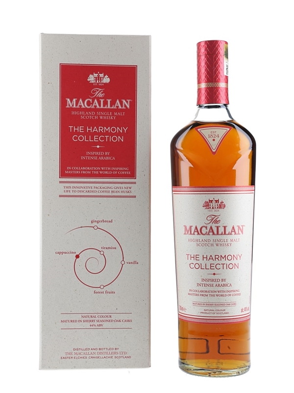 A bottle of The Macallan Intense Arabica Highland Single Malt Scotch Whisky from The Harmony Collection. This is inspired by the Ethiopian Arabica bean, in collaboration with inspiring masters from around the world of coffee.
