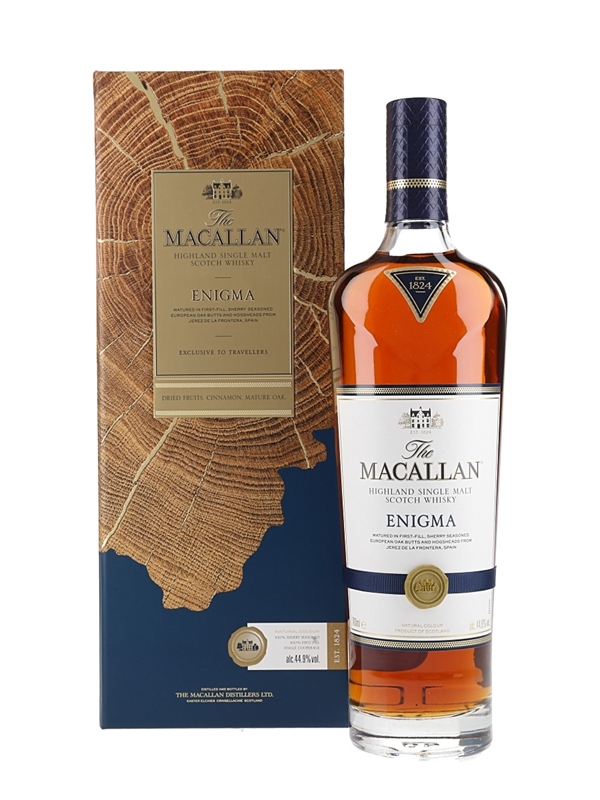 A bottle of The Macallan Enigma Highland Single Malt Scotch Whisky. This travellers exclusive release was aged in sherry seasoned European oak butts and hogsheads from Jerez de la Frontera, Spain.