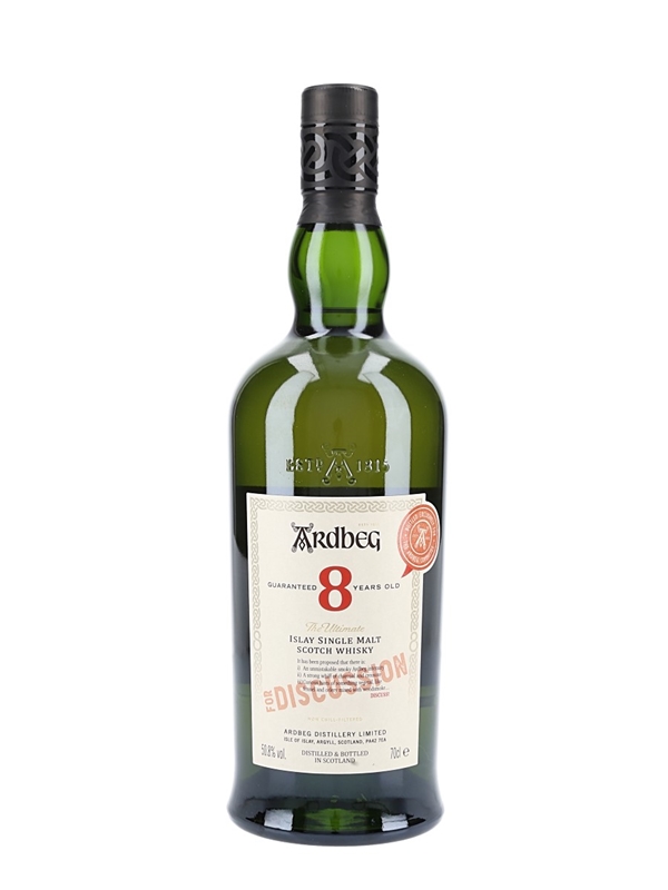 A bottle of Ardbeg 8 Year Old The Ultimate Islay Single Malt Scotch Whisky bottled at a cask strength of 50.8% ABV. This is an intense, smoky whisky with notes of charcoal and creosote and described by Ardbeg to be 'deliberately challenging'.