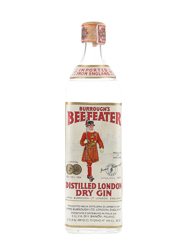 A bottle of Beefeater London Dry Gin, produced by James Burrough Ltd. London, England. This was imported to Italy by Silva, we estimate in the 1960s.