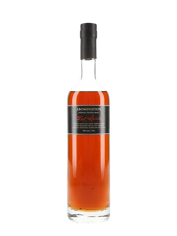 A bottle of Lost Spirit Abomination Heavily Peated Malt. A spirit distilled from 100% Malted Barley with late Harvest Riesling seasoned American Oak cask.