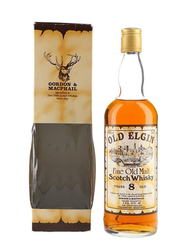 A bottle of Old Elgin 8 Year Old Fine Old Malt Scotch Whisky, bottled by Gordon & MacPhail and specially selected for FPS 1979-1989 10th Anniversary Presidents' Selection.
