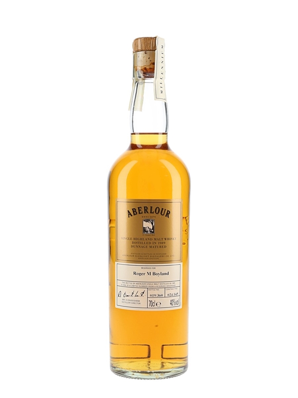 A bottle of Aberlour 1989 Single Highland Malt Scotch Whisky. This is bottle number 019 of 360. The label is personalized with the original owner's name.