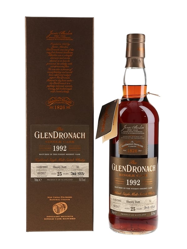 A bottle of Glendronach 25 Year Old Highland Single Malt Scotch Whisky. This was distilled on 13 May 1992, matured in a single sherry butt and bottled at 58.5%ABV in May 2017.