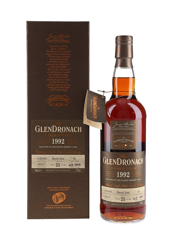 A bottle of Glendronach 25 Year Old Highland Single Malt Scotch Whisky. This was distilled on 15 May 1992, matured in a single sherry butt and bottled at 57%ABV in May 2017.
