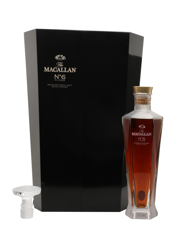 A bottle of The Macallan No. 6 in Lalique Decanter Single Malt Scotch Whisky. This was matured for an undisclosed length of time in first fill Jerez de la Frontera Sherry Casks and is presented in a Lalique crystal decanter designed by French Company Lalique, housed in a mirrored presentation case and bottled as part of the 1824 Master Series.