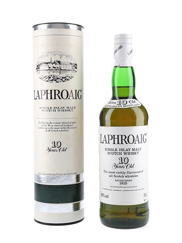 A bottle of Laphroaig 10 Year Old Single Islay Malt Scotch Whisky. We estimate this was bottled in the late 1980s.