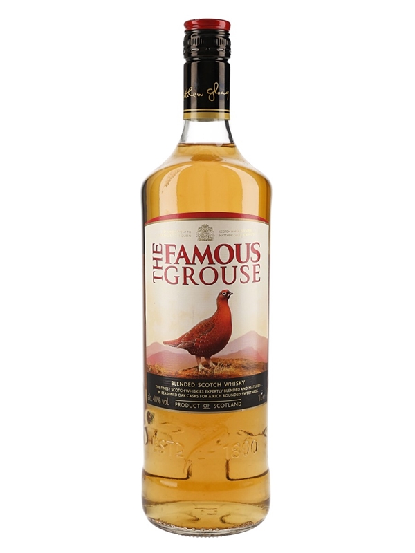 A litre bottle of The Famous Grouse Blended Scotch Whisky, produced by Matthew Gloag & Son Ltd. The label carries a royal warrant by appointment to Her Majesty The Queen.