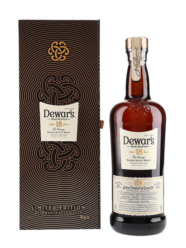 A litre bottle of Dewar's 18 Year Old Blended Scotch Whisky, married in Oak Casks. This is a blend of old and rare Highland, Speyside, and Lowland malt and grain whiskies.