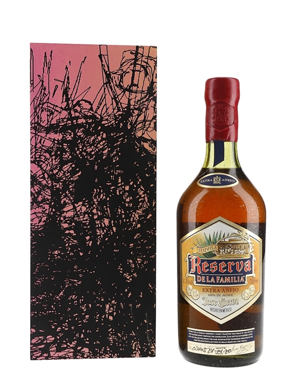 A bottle of Jose Cuervo Reserva de la Familia Extra Añejo Tequila, bottled on 24 November 2020. The Reserva de la Familia was first produced in 1995 to commemorate the 200th anniversary of Jose Cuervo. This edition comes in a wooden presentation box with artwork by Mexican artist Jorge Pardo.