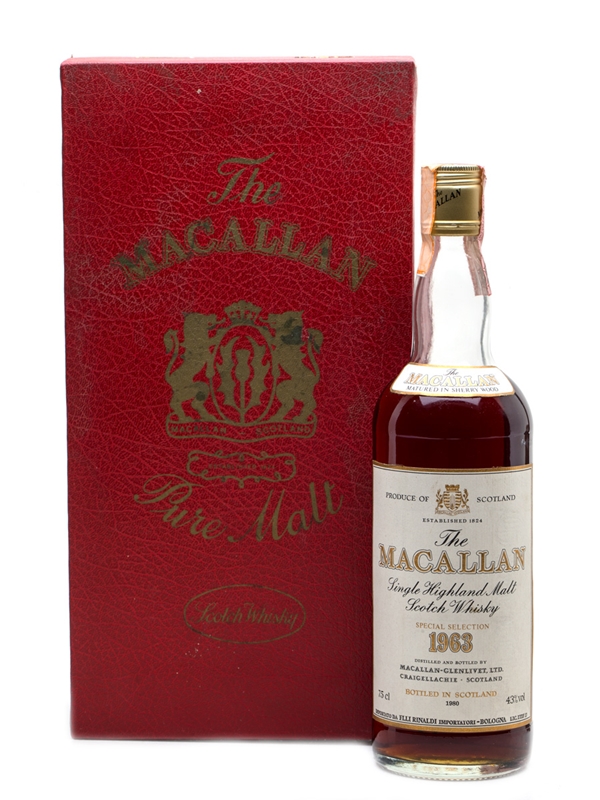 A bottle of The Macallan 1963, bottled in 1980 for Italian importer Rinaldi.