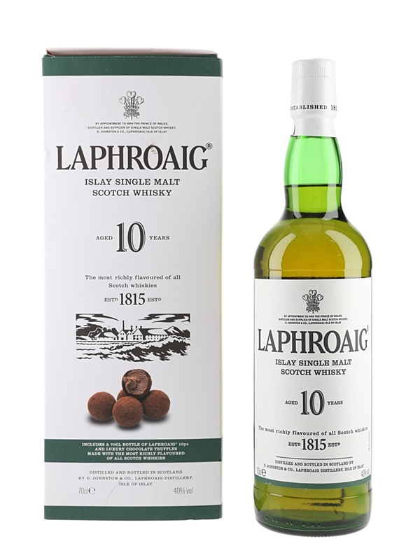 A bottle of Laphroaig 10 Year Old Single Islay Malt Scotch Whisky. Please note the truffles referenced on the packaging are not included.