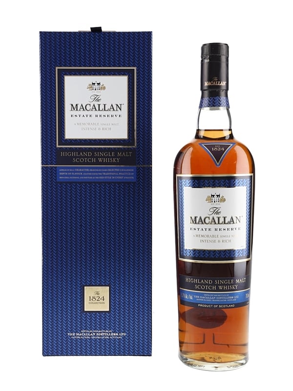 A bottle of The Macallan Estate Reserve Highland Single Malt Scotch Whisky, released for travel retail as part of The 1824 Collection. This whisky was bottled at the traditional strength of 80 UK proof (45.7%).