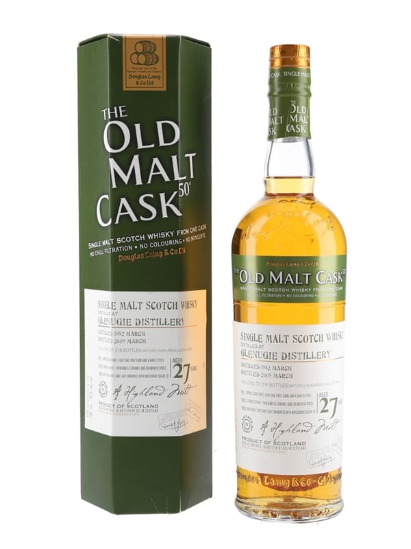 A bottle of Glenugie 27 Year Old Single Malt Scotch Whisky. This was distilled in March 1982, matured in a single bourbon cask and bottled at 50% ABV in March 2009 by Douglas Laing & Company Ltd. for The Old Malt Cask range.