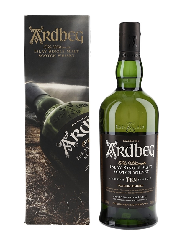 A bottle of Ardbeg 10 Year Old The Ultimate Islay Single Malt Scotch Whisky. The bottling code indicates this was bottled in 2014.