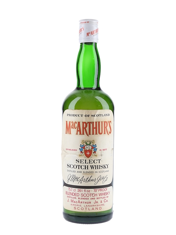 A bottle of MacArthur's Select Scotch whisky, produced by J.MacArthur Jr & Co of Airdrie in Lanarkshire. We estimate this was bottled in the 1970s.