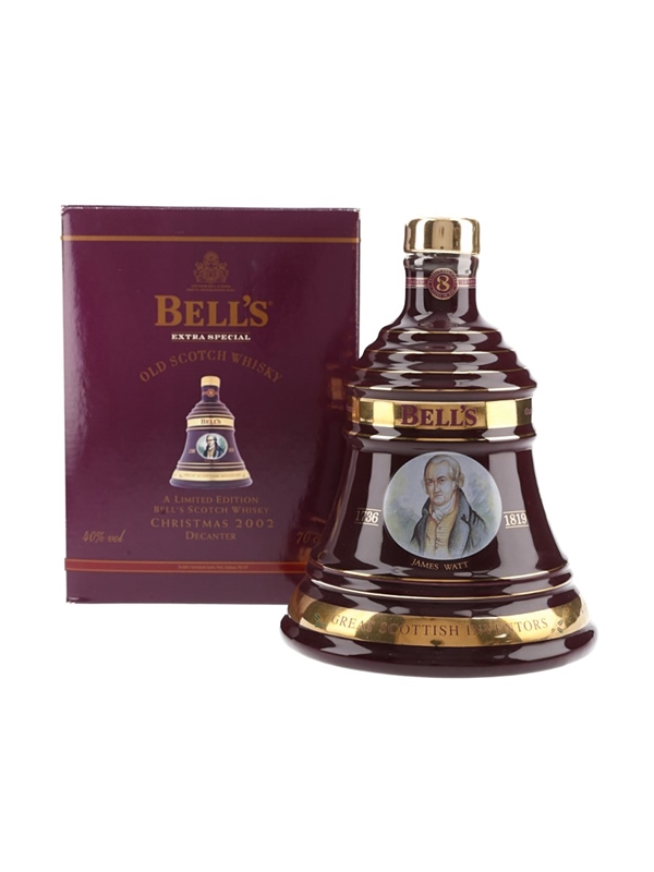 A bottle of Bell's Old Scotch Whisky produced by Arthur Bell & Sons, presented in a ceramic Wade decanter and released for Christmas 2002. This contains Bell's Extra Special 8 Year Old whisky. This decanter is dedicated to the great Scottish inventor James Watt.