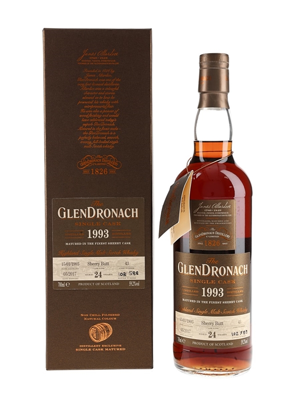 A bottle of Glendronach 24 Year Old Single Malt Scotch Whisky. This was distilled on 15 January 1993, matured in a single sherry butt and bottled at 59.2%ABV in May 2017.